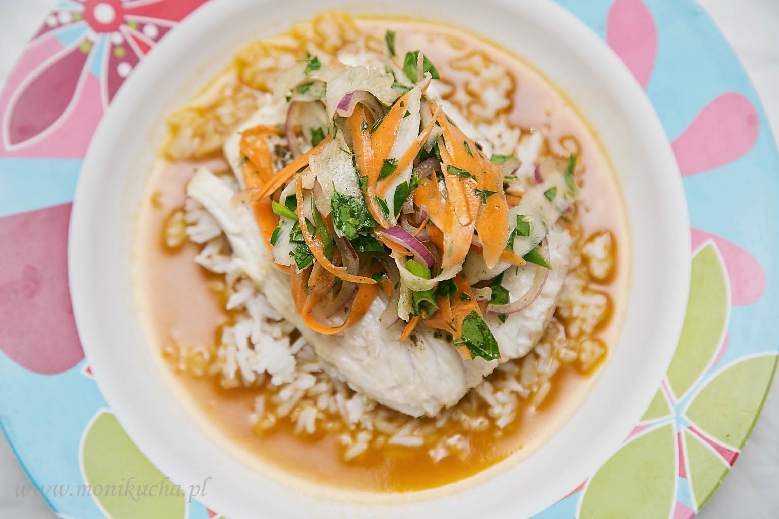 Na głębokim talerzu wylewamy nabierkę sosu pomarańczowego. Układamy ryż, na nim filet razem z sałatką.